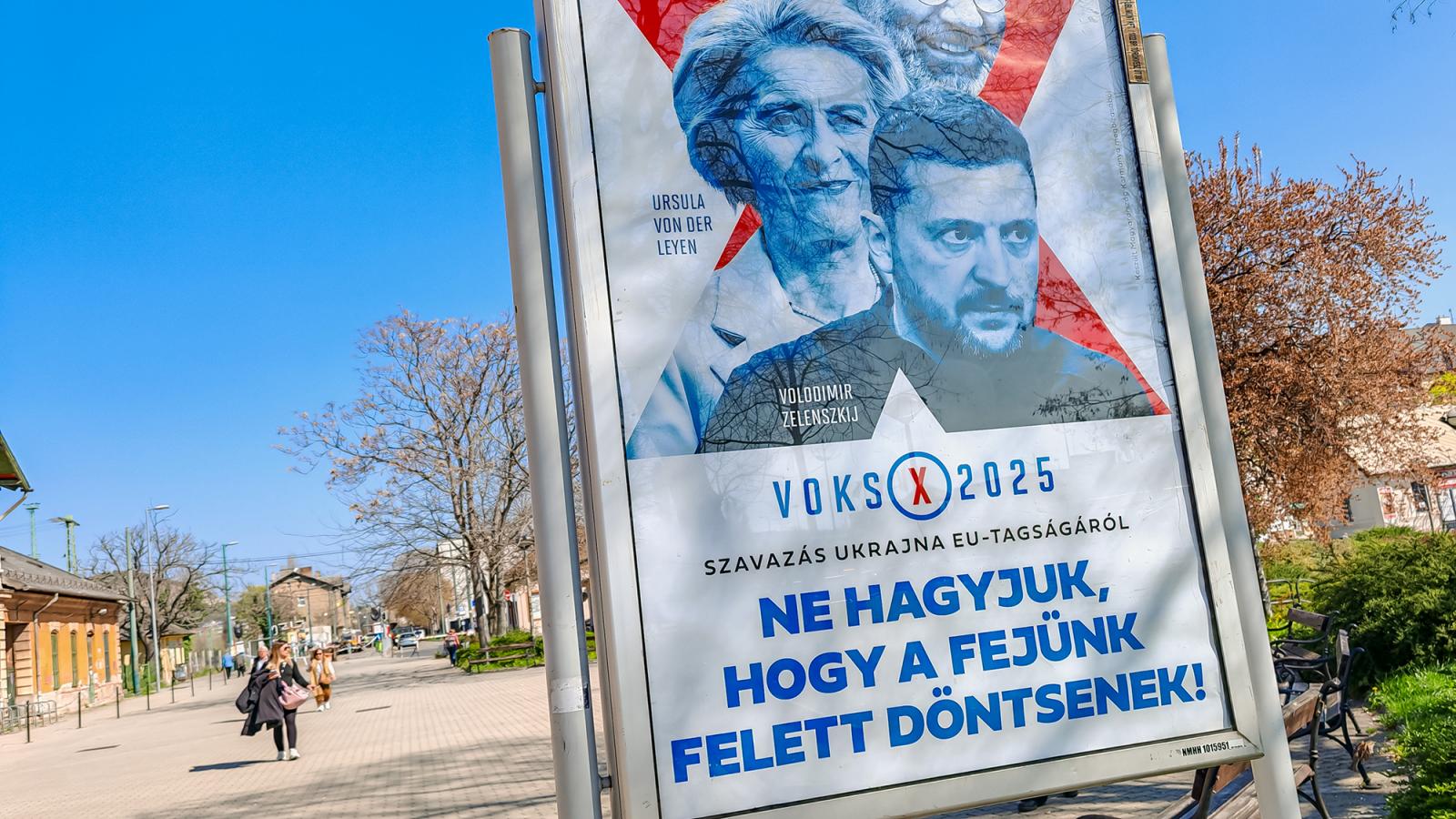 Ez a kampány, amely Ursula von der Leyen, Manfred Weber és Volodimir Zelenszkij arcképével próbálja riogatni a lakosságot, a Voks2025 néven fut. A cél, hogy a közvéleményt egy véleménynyilvánító szavazásra ösztönözze, amely Ukrajna uniós tagságának elutasítását célozza.