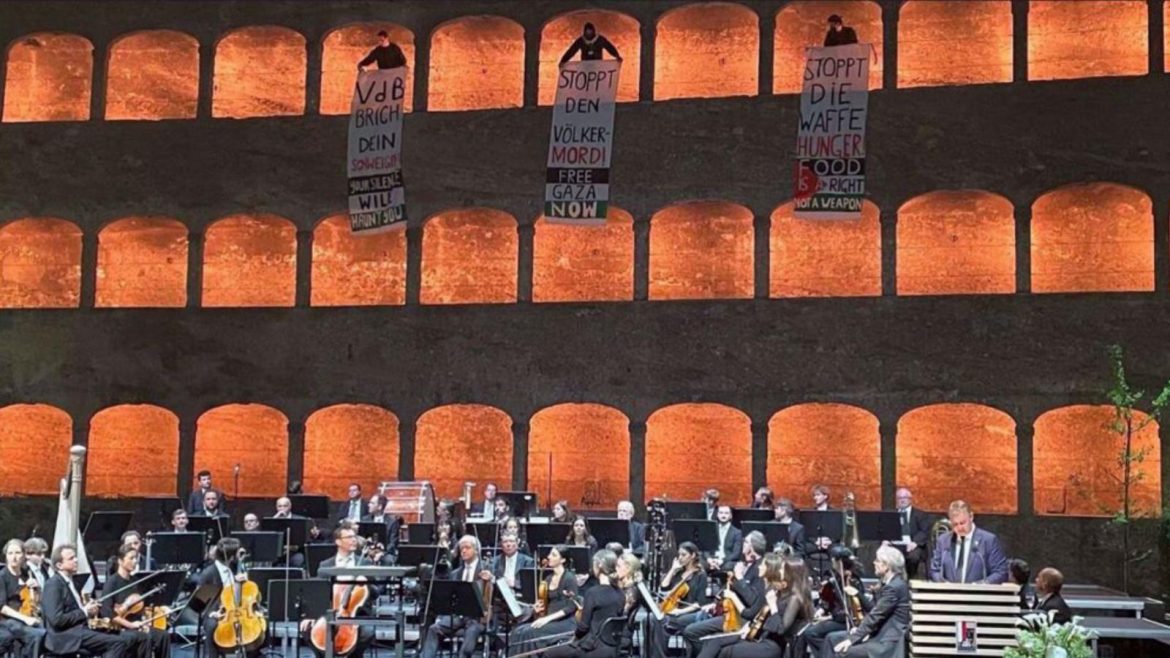 A Salzburgi Ünnepi Játékok megnyitója során váratlan zűrzavar keletkezett, amikor palesztinpárti aktivisták betörtek a Felsenreitschule színpadára, hogy saját üzeneteiket hangoztassák. Az osztrák politikai elit, beleértve az alkancellárt és a kulturális minisztert, a helyszínen tanúja volt a botrányos akciónak, amely során tiltakozó transzparensek kerültek elő, felszólítva a közönséget Izrael tetteinek elítélésére.